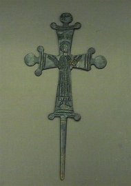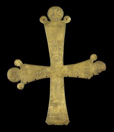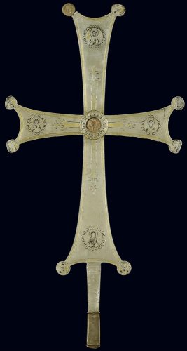 Inscribed silver processional cross from Adrianople with incised decoration, parcel-gilt, and details picked out in niello. The busts of saints are portrayed in medallions on the arms of the cross. On the two sides of the base are dedicatory inscriptions commemorating the donors Sisinios and Ioannis the Presbyter. This is one of the most splendid and best preserved crosses of the Middle Byzantine period; about 1000. H. 0.51 m. (ΓΕ 33794)