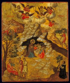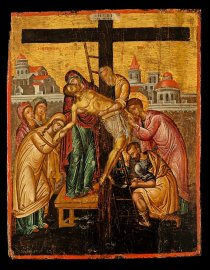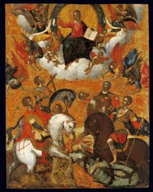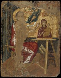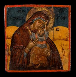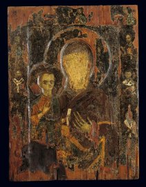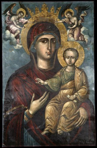 Virgin and Child. Ilias Moskos. Second half of 17th c. The soft rendering of the faces and the iconography of the angels crowning the Virgin are inspired by Western prototypes. The icon is painted with egg-tempera on bronze sheet. H. 0,98 m., W. 0,63 m. (ΓΕ 2995)