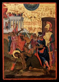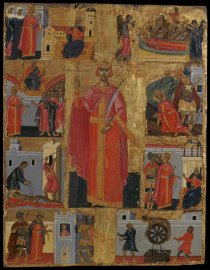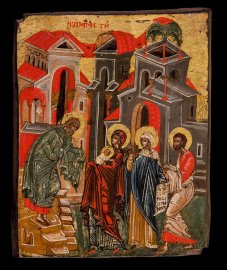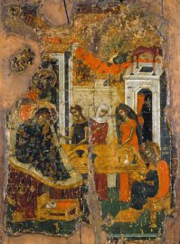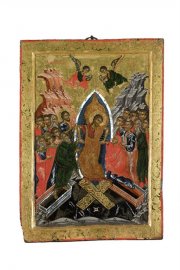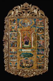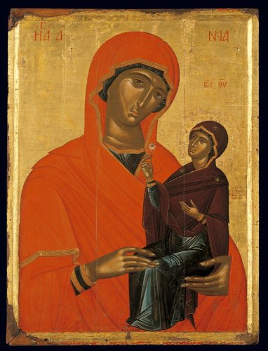 Icon of St Anne with the Virgin. In this remarkable product of the Cretan School, associated with the workshop of the painter Angelos and dated to around the mid-15th c., the striking wealth of brilliant colour evokes an awareness of the profound sanctity implicit in the composition. A faked signature of Emmanuel Tzanes and the date 1637 were added at the beginning of the 20th c. During the recent cleaning and conservation of the icon, it was decided to keep this inscription as evidence of the preferences shown by collectors in those days. 1.06x0.76 m. (ΓΕ 2998)